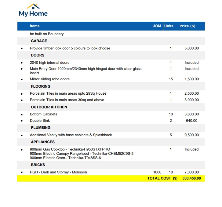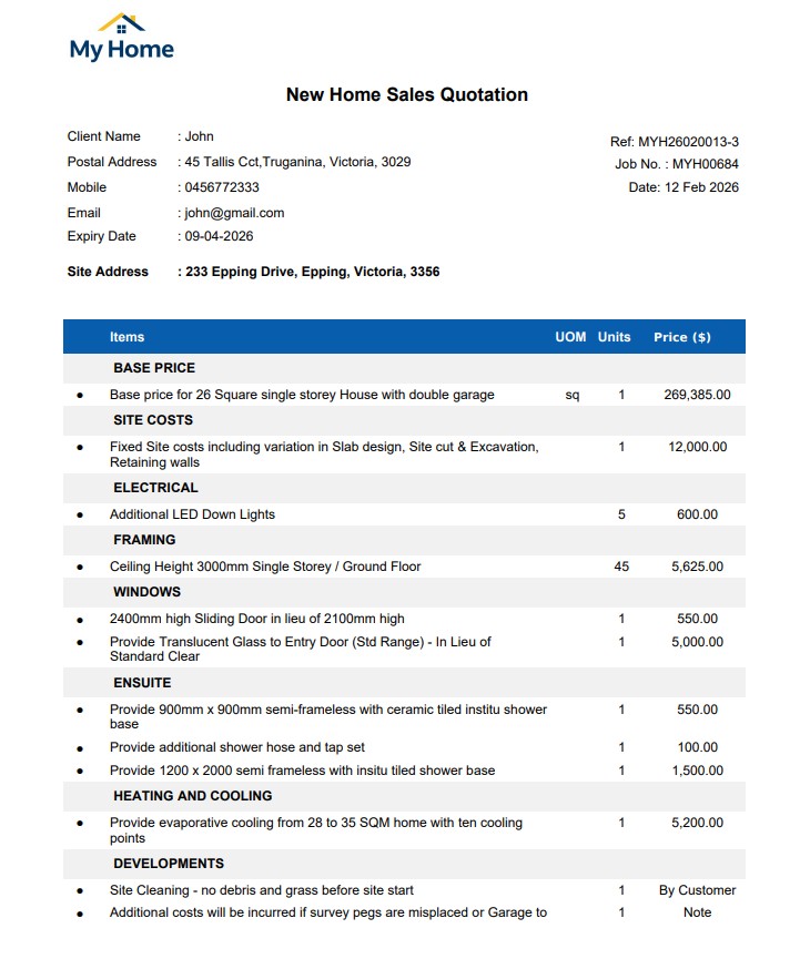 This feature helps home builders quickly generate accurate, professional quotes and tenders, reducing manual effort and ensuring consistency in pricing and documentation.